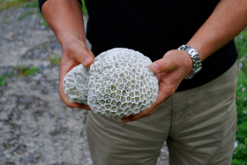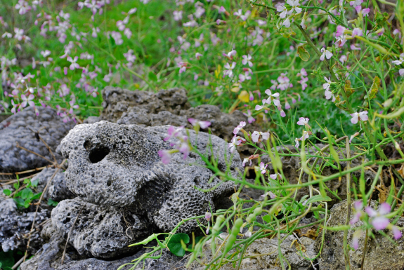 串本海中公園のそばに感動的な小路があります。周辺でダイビングをする人が「コーラルロード」と呼ぶ道です。「珊瑚礁の道」。命を終えた珊瑚礁が土に環えるのを待つ場所です。草花と共に静かに佇む珊瑚礁は美しい。