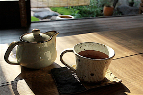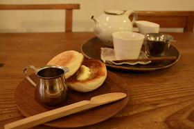 自家製マフィンとバターはちみつ。奥は京都産のほうじ茶