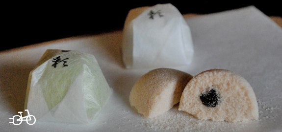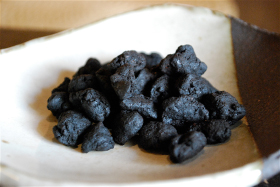 大徳寺納豆のおいしさを活かしたお菓子が「本家 磯田」 さん にあります。それが落雁のなかに大徳寺納豆が入った「三彩」。白、ニッキ、抹茶と三種類の落雁の中に大徳寺納豆が入っています。甘いなかに、大徳寺納豆のしょっぱさが映えるお味です。お茶菓子としても相性が良いのです。