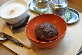 玄米おはぎとソイラテ。動物性の食材を使わないメニューがほとんどですのでベジタリアンにもおすすめ。